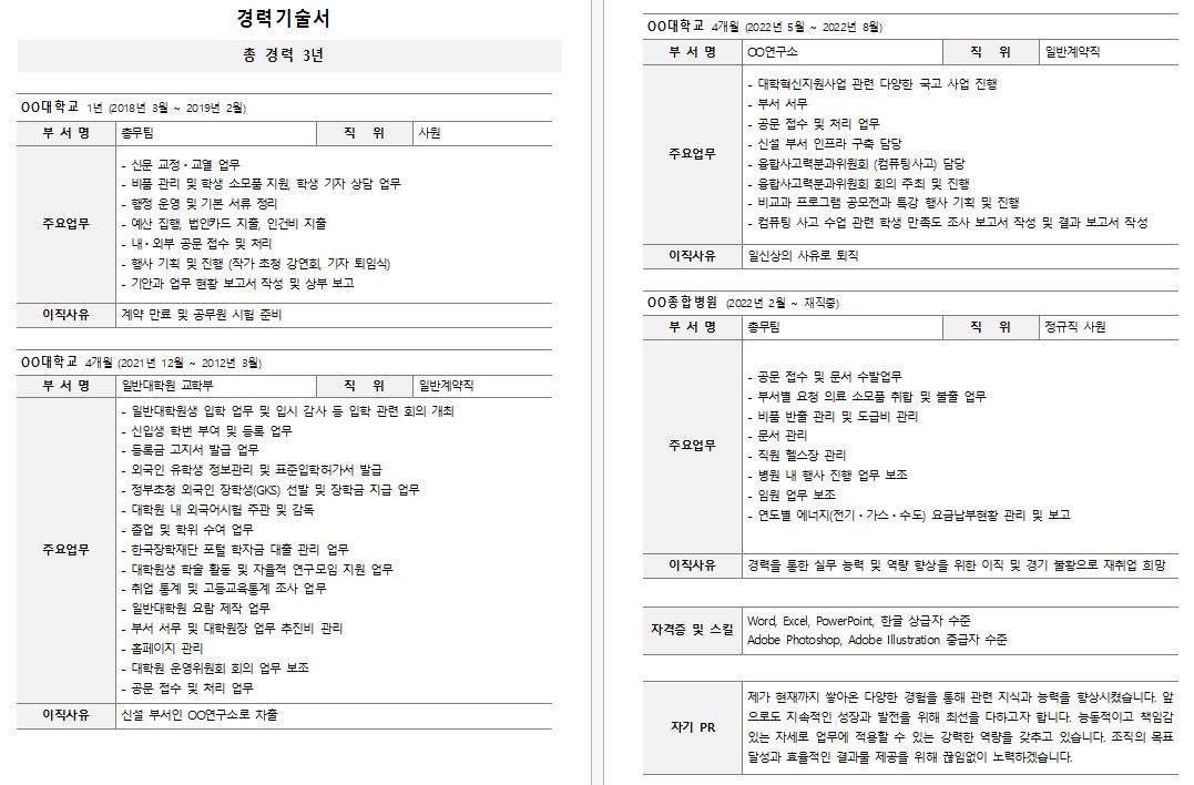 경력기술서는 이직 과정에서 지원자의 전문성과 경험을 효과적으로 전달하는 중요한 도구입니다. 간결하면서도 설득력 있는 내용으로 작성하여, 면접관에게 긍정적인 인상을 주는 것이 중요합니다.