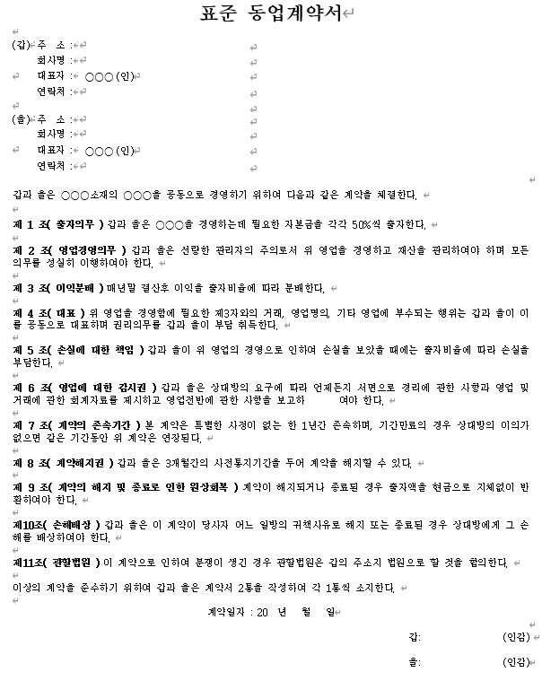 동업계약서는 동업 관계에서 발생할 수 있는 다양한 문제를 예방하고, 사업의 원활한 운영을 돕습니다. 제대로된 계약서 없이 동업을 시작하는 것은 예기치 못한 문제를 초래할 수 있으므로, 계약서 작성은 매우 중요합니다.