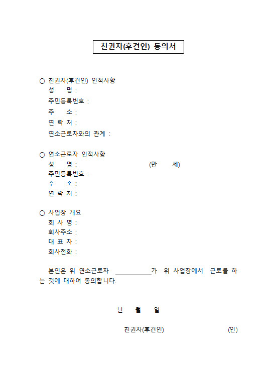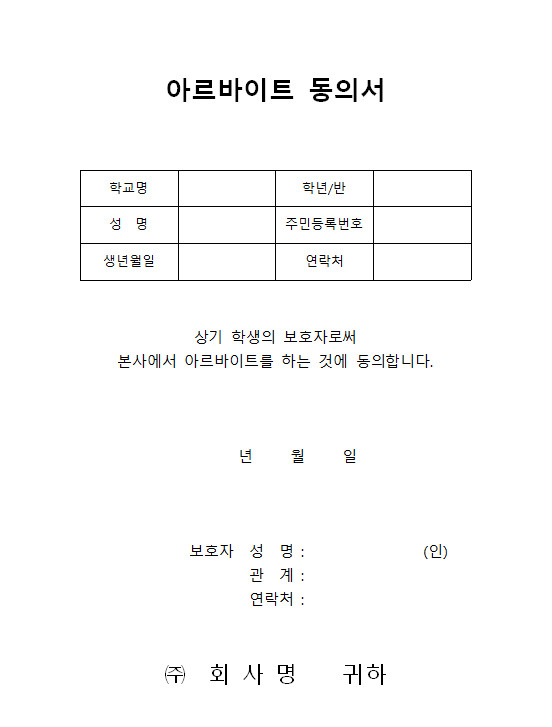 미성년자 아르바이트 부모님 동의서 양식 다운로드