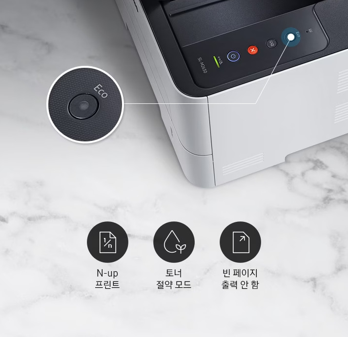 SL-M2630은 원터치 에코 모드로 토너와 용지 사용을 획기적으로 줄입니다. 사용자는 간편한 버튼 조작만으로 에코모드를 활성화시켜, 토너 절약, N-up 프린트, 빈 페이지 출력 제외 등 다양한 환경 친화적 기능을 활용할 수 있습니다. 이는 비용 절감과 함께 지속 가능한 사무 환경 조성에 기여합니다.