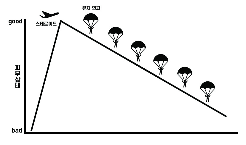 연고의 사용법은 이렇습니다. 스테로이드가 함유된 연고를 3~4일 정도 발라줍니다. 처음 바르게 되면 증상이 눈에 띄게 호전되며, 피부가 빠른속도로 회복됩니다. 3~4일 이후엔 나머지 연고를 매일 발라주면서, 케어해줍니다. 이렇게 유지되는 연고를 쓰다가 보면 한달정도 유지되다가 또 다시 환부가 빨개지고 각질이 스멀스멀 올라오기 시작합니다. 이 때 다시 스테로이드 연고를 써서 잡아주고 유지하고 이런 패턴으로 평생 케어 해주셔야 합니다. ㅠㅠ