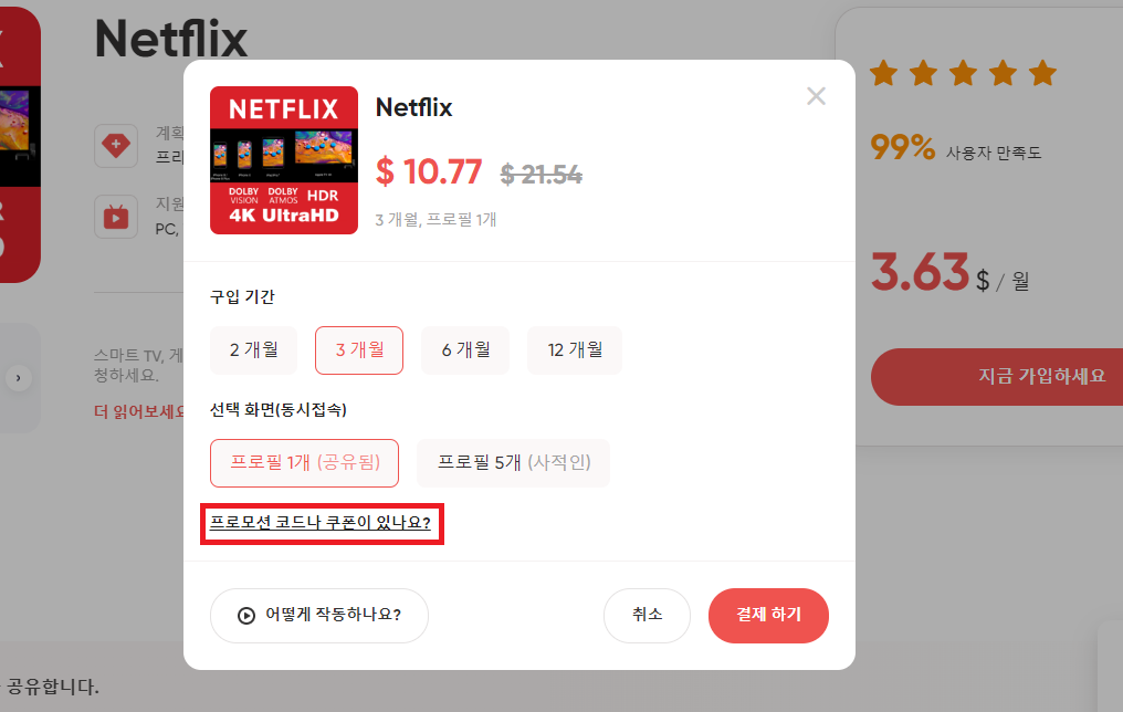 넷플릭스 프리미엄 요금제를 월 4천원의 금액대로 이용할 수가 있습니다.