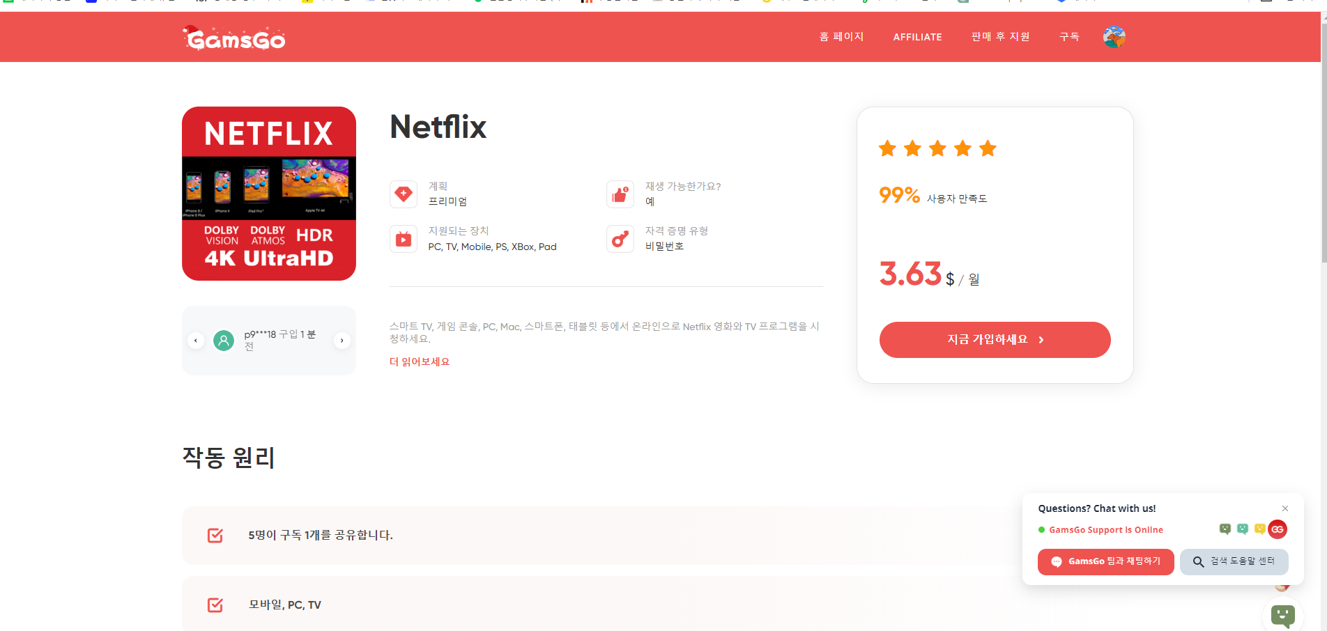 겜스고에서 넷플릭스를 결제 하셨다면 사용을 위해 아이디와 비번을 확인 해야 합니다. 상단 우측 화면에 구독 버튼을 누르면 확인하실 수 있습니다. 아이디와 비번을 확인하셨다면 넷플릭스를 접속하여 해당 아이디와 비밀번호를 입력하시면 됩니다.