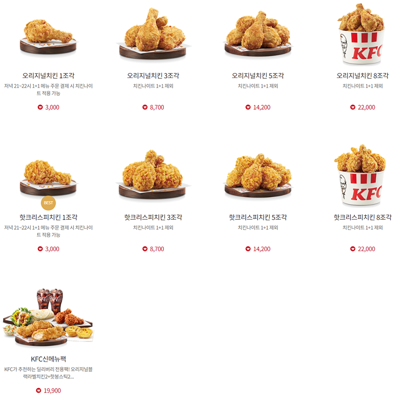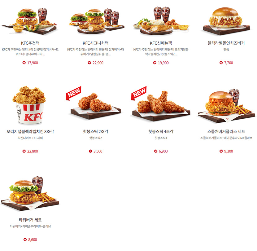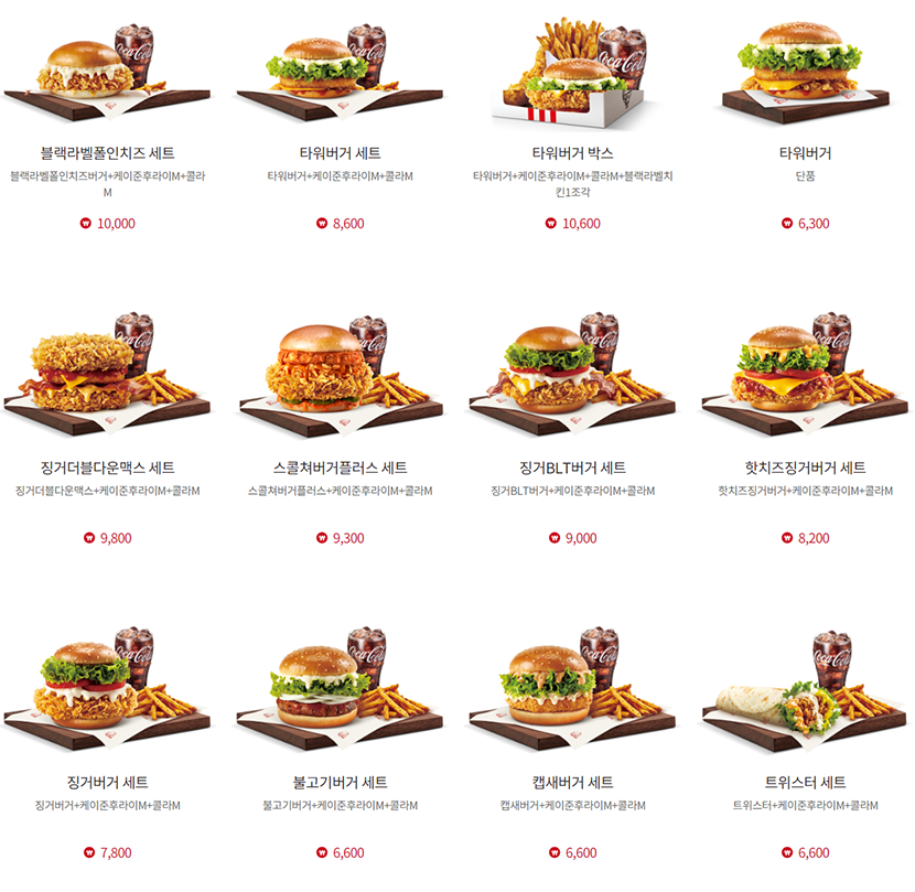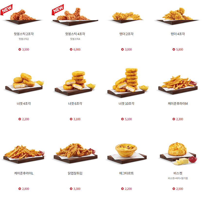 오늘은 KFC의 메뉴판을 준비해 봤습니다. 요즘엔 홈페이지를 가봐도 가격이 안 적혀있거나 옛날 가격이라 확인이 어려울 때가 있습니다. 보기 편하게 전 메뉴를 총정리해보았습니다.