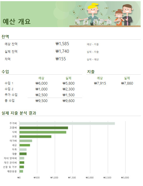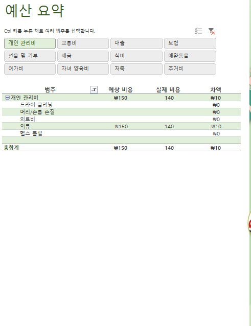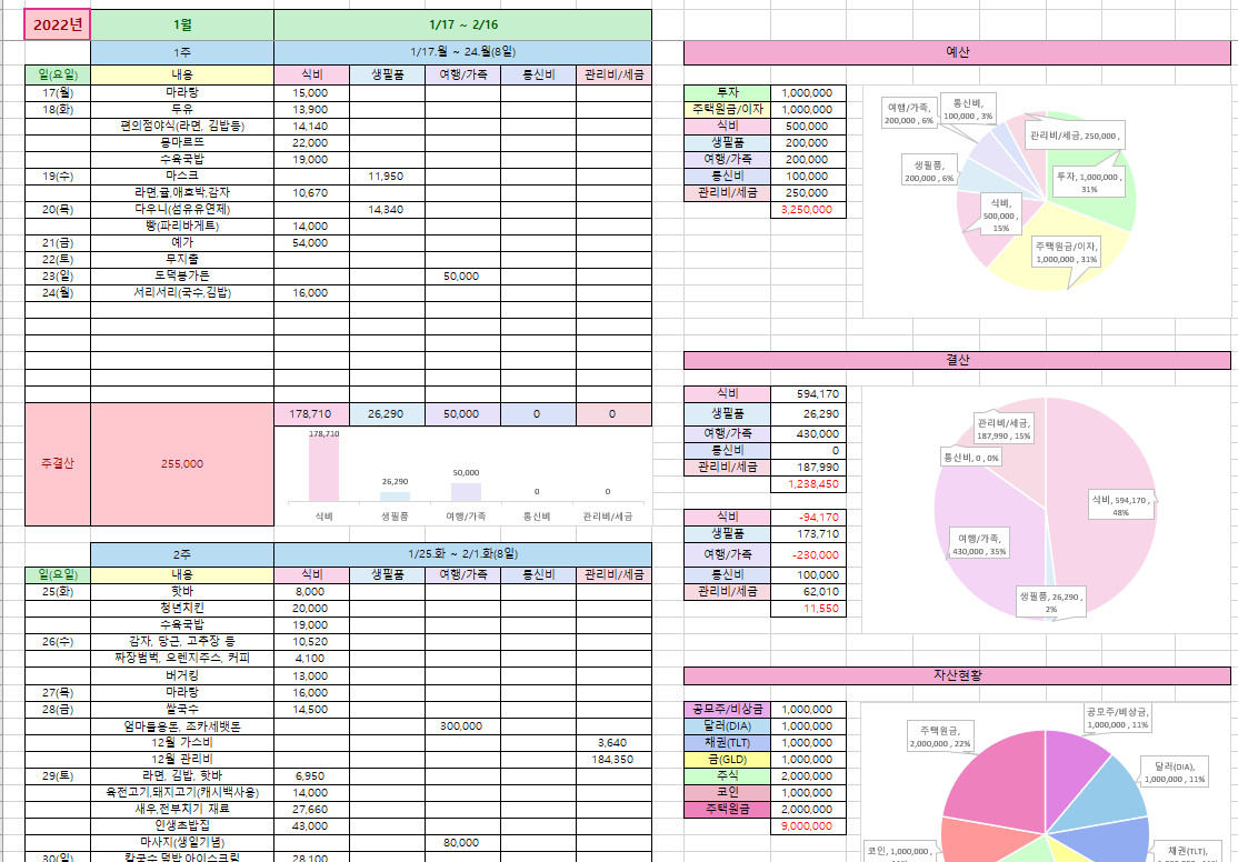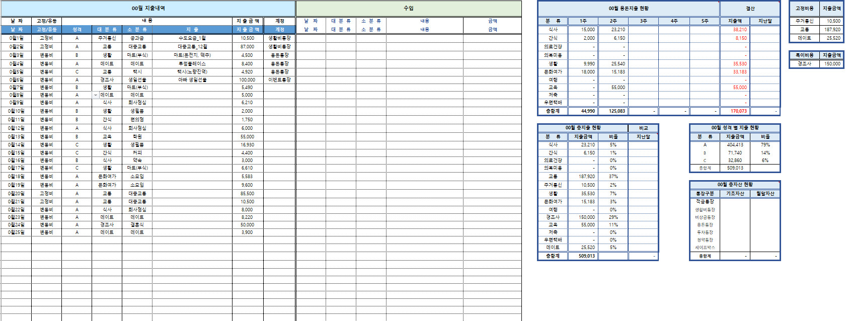 수입과 지출을 카테고리별로 분류하고 정리하여, 가계예산의 현황을 한눈에 파악합니다.