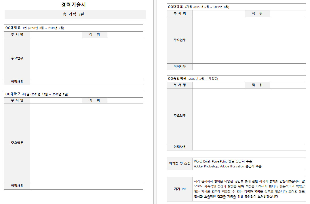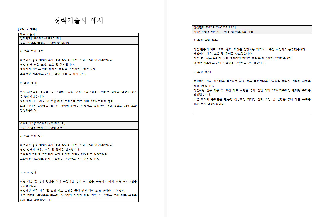 경력기술서는 이직 과정에서 지원자의 전문성과 경험을 효과적으로 전달하는 중요한 도구입니다. 간결하면서도 설득력 있는 내용으로 작성하여, 면접관에게 긍정적인 인상을 주는 것이 중요합니다.