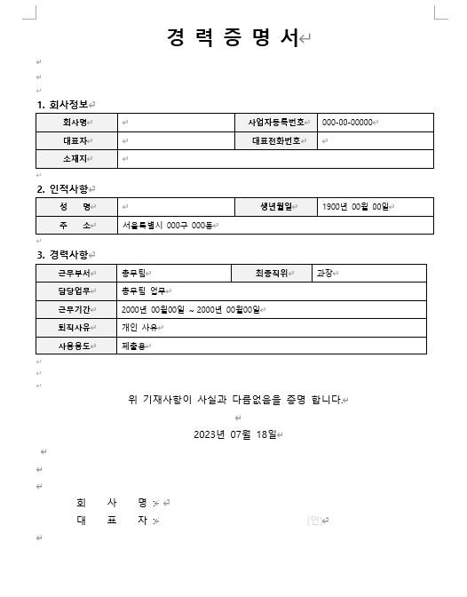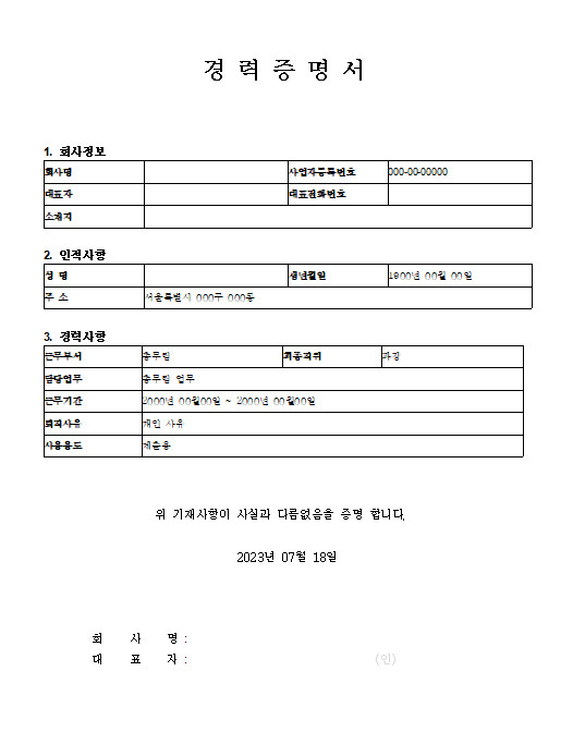경력증명서 양식 다운로드