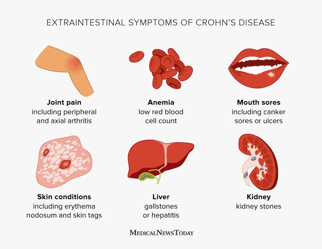 - 가스트로듀오덴럴 크론병: 위와 소장의 시작 부분에 영향을 미치며, 복부 위쪽 통증과 구토, 메스꺼움이 나타납니다.