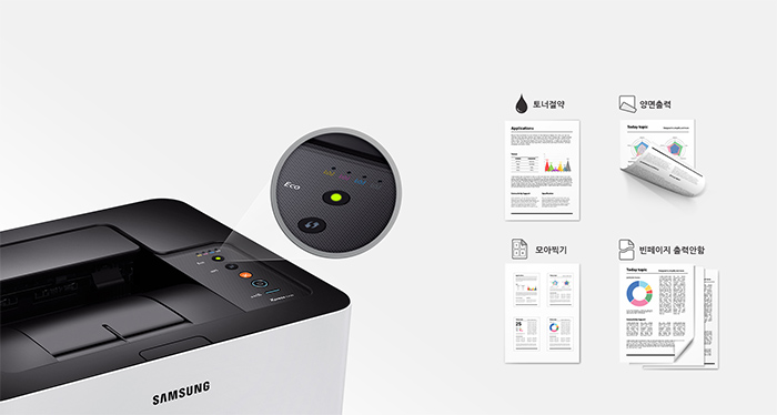 1. 에코모드 전환: 토너와 용지 절약을 위한 원터치 에코 버튼으로 간편하게 에코모드로 전환할 수 있습니다.