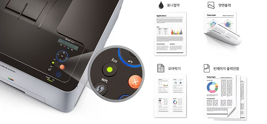 에코 버튼을 이용해 토너와 용지를 절약하는 에코모드로 쉽게 전환할 수 있습니다. 사용자 환경에 맞추어 설정한 원터치 에코 버튼은 토너절약, 양면출력, 모아찍기, 빈 페이지 출력 안 함 등의 모드로 경제적인 인쇄를 가능하게 합니다.