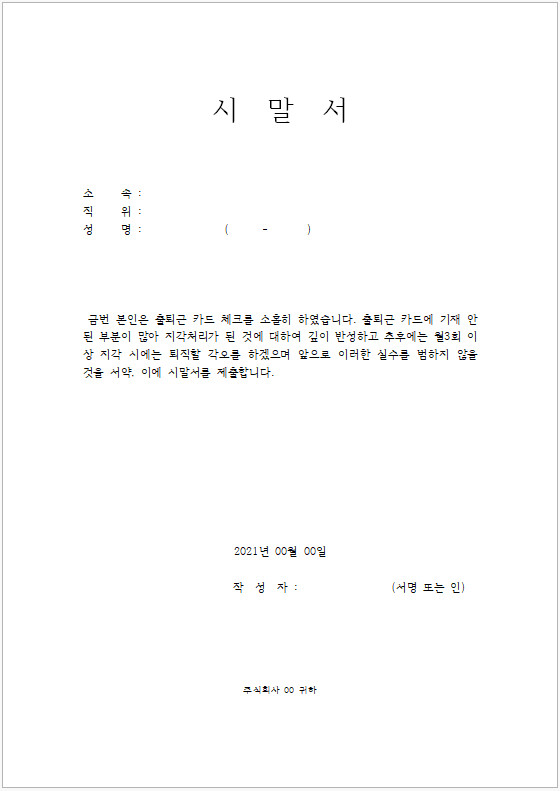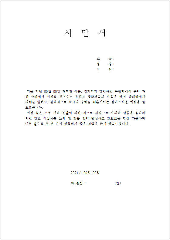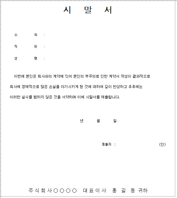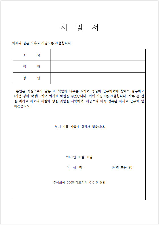 시말서에는 특별한 양식이 정해져 있지 않지만, 일반적으로 통용되는 깔끔하고 명료한 구성을 사용하는 것이 바람직합니