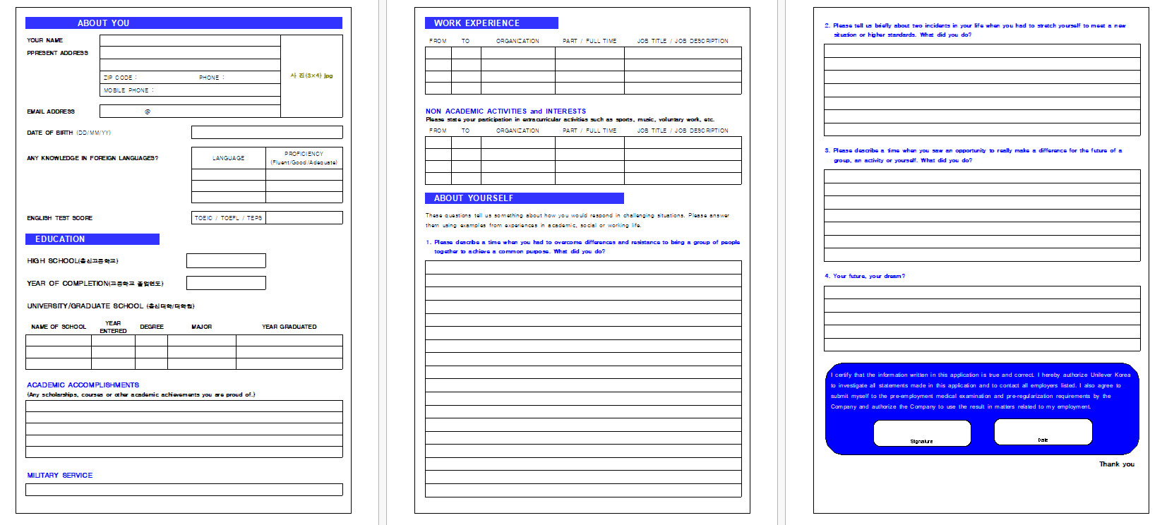 - 학교나 이전 직장에서의 활동 경력을 요약하여 기재합니다.