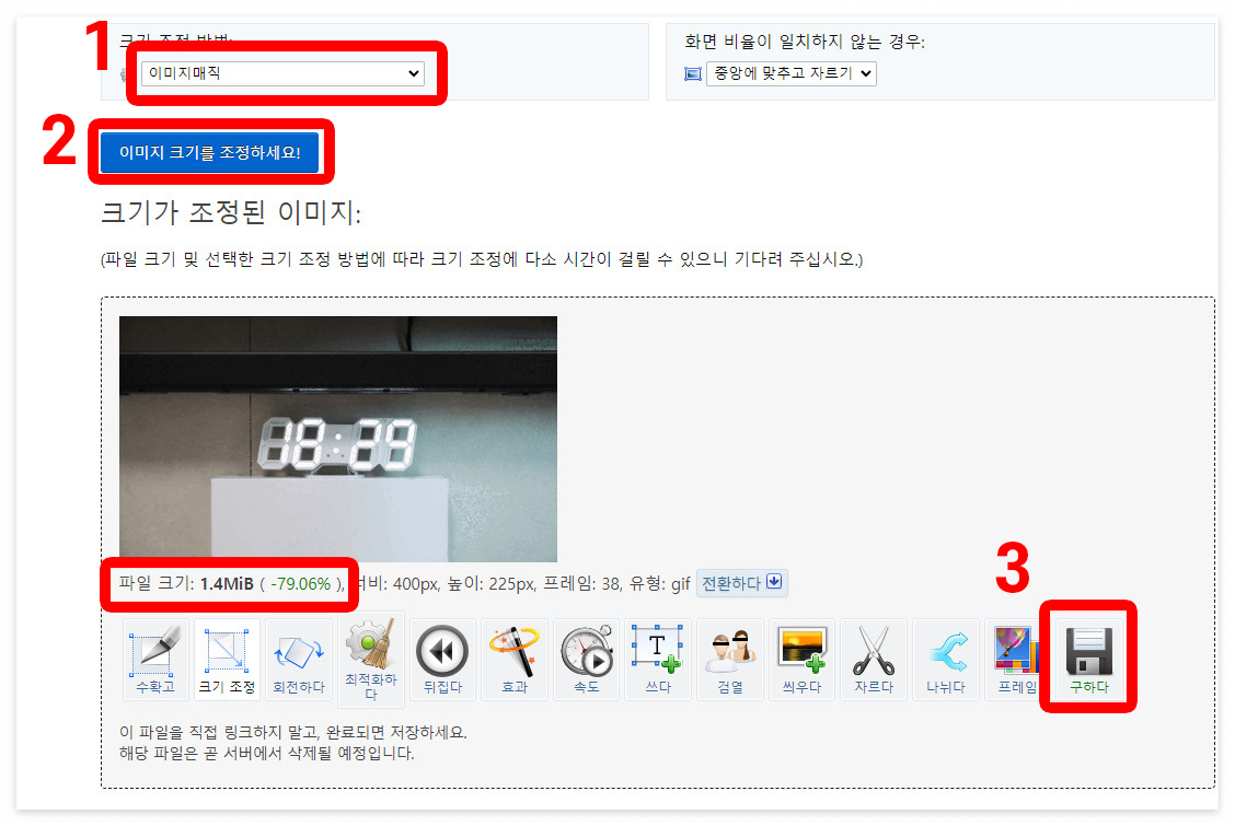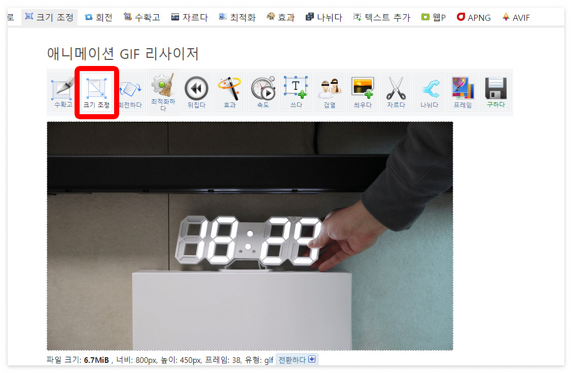 업로드 하면 화면과 같이 상단에 메뉴가 나열되고 그 아래 원본 움짤이 나옵니다. 이 때 크기 조정이라는 메뉴를 선택합니다.
