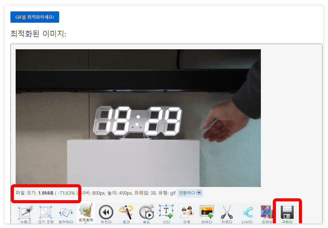 화면을 아래로 내리면 움짤 사이즈는 원본과 같은데 용량이 확 줄어든 것을 확인할 수 있습니다. 퀄리티 다운을 했지만, 원본 대비 육안으로 구분하기 힘든 정도의 다운이 됐네요.