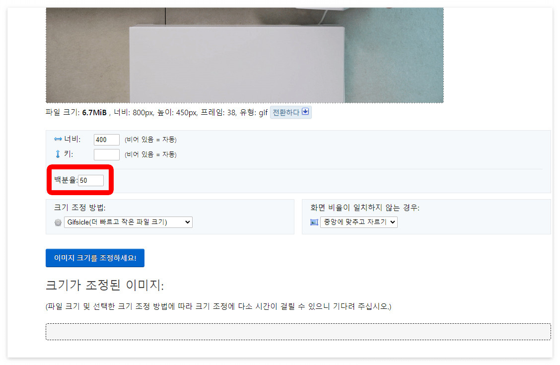 원본 크기를 100으로 봤을 때, 몇 퍼센트나 줄일 것 인가를 써줍니다. 저는 50%로 적었습니다.