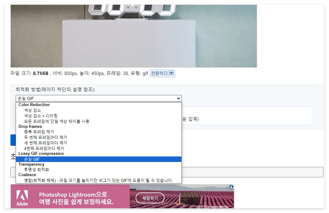 화면을 아래로 내려서 최적화 방법에 '손실 GIF' 선택 해줍니다.