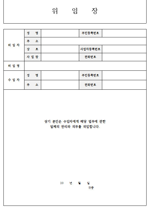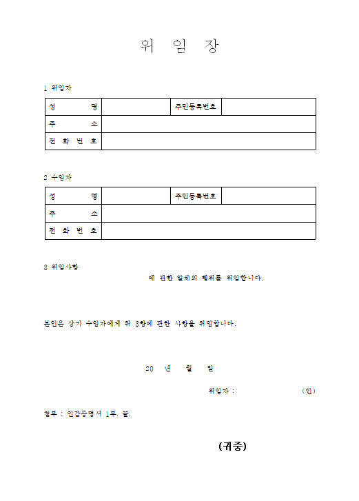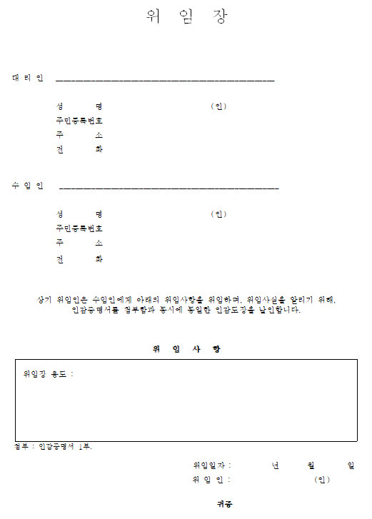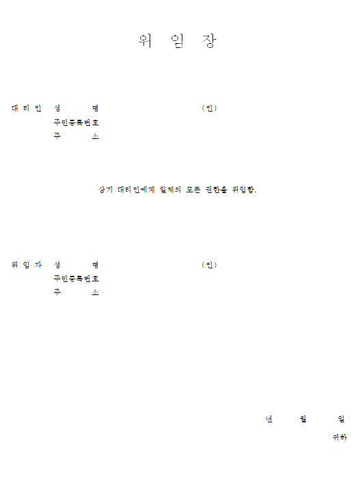 - 위임장은 원본이어야 하며, 복사본은 법적 효력이 떨어질 수 있습니다.