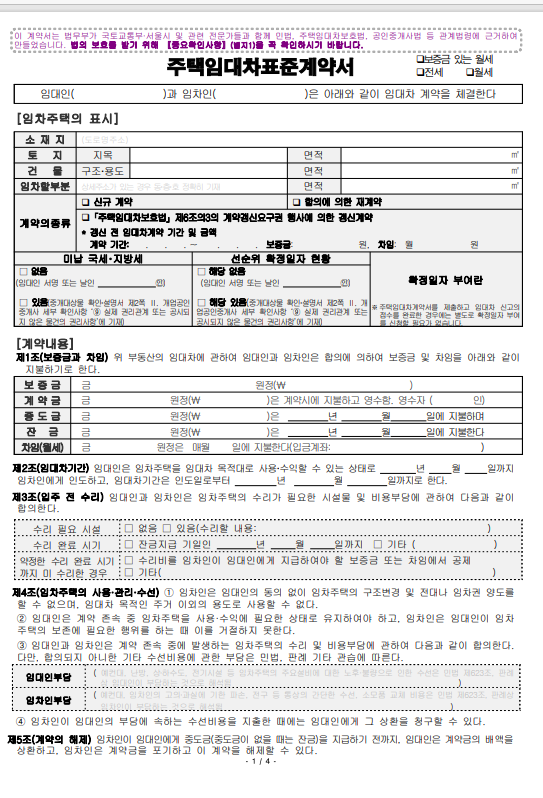 2021년 8월에 개정된 임대차보호법과 2022년 11월에 개선된 임대차 제도는 부동산 임대 시장에 중요한 변화를 가져왔습니다. 오늘은 새롭게 필요해진 표준임대차계약서의 양식을 공유 드리고 그에 따른 작성 방법 또한 알아 보겠습니다. 본 포스팅을 통해 임대인과 임차인 모두가 보다 안전하고 효율적인 임대차 거래를 이해 할 수 있을 것이라 생각 합니다.